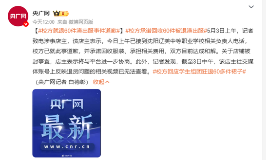 据@央广网 5月3日消息,当日上午,记者致电涉事店主,该店主表示,今日上午已接到沈阳辽美中等职业学校相关负责人电话,校方已就此事道歉,并承诺回收服装、承担相关费用,双方目前达成和解。关于店铺被封事宜,店主表示将与平台进一步协商。此外,记者发现,截至3日中午,该店主社交媒体账号上反映退货问题的相关视频已无法查看。